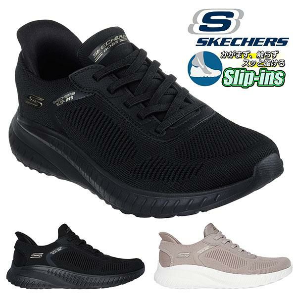 手を使わずにスッと履ける 送料無料 スケッチャーズ スリッポン スニーカー SKECHERS レディース SLIP-INS SLIP-INS BOBS SQUAD CHAOS スリップインズ ボブス スクワッド カオス 幅広 ワイド シューズ 靴 ブラック 黒 トープ 117497W 2025秋冬新作 20%off