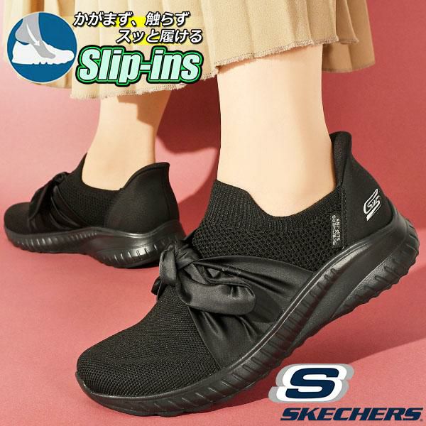 手を使わずにスッと履ける 送料無料 スケッチャーズ スリッポン スニーカー SKECHERS レディース SLIP-INS BOBS SQUAD CHAOS-INSPIRE AWAY スリップインズ ボブス スポート スクワッド カオス インスパイア アウェイ シューズ 靴 リボン ブラック 黒 117630 2025春新作