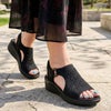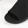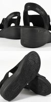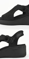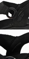 ラインストーン付きニットアッパーにロゴ入りO字型ループのディテールをあしらった、スリップオンのファッションウェッジサンダル。