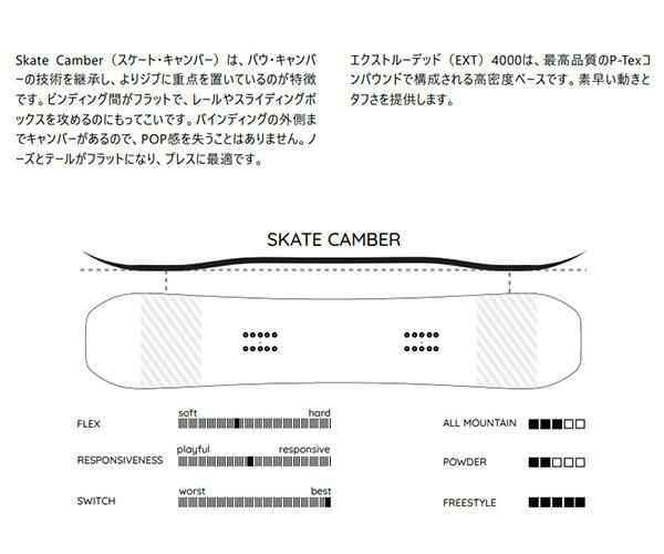 Skate Camber(スケート・キャンバー)は、パウ・キャンバーの技術を継承し、よりジブに重点を置いているのが特徴です。
