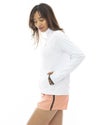 光沢を抑えた上質の吸水速乾スムースを使用し、UPF(紫外線防止指数)50+のUVプロテクションとハイネックのチンガード、フード、サムホール付きの長袖がしっかりと日差しから肌を守ります。