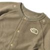 「ラッチ」とは編み機の針の部品のこと。ラッチ部分の針を使って飛ばし編みをすることで、短いパイル組織を形成しています。ロンパースは脱ぎ着がしやすいドットボタン仕様で、股部分は掛け違いを防止するカラープラドットボタンを配置。スタイはドットボタンでロンパースに直接装着するタイプで、赤ちゃんが寝ている状態でも前から簡単に付け外しができます。