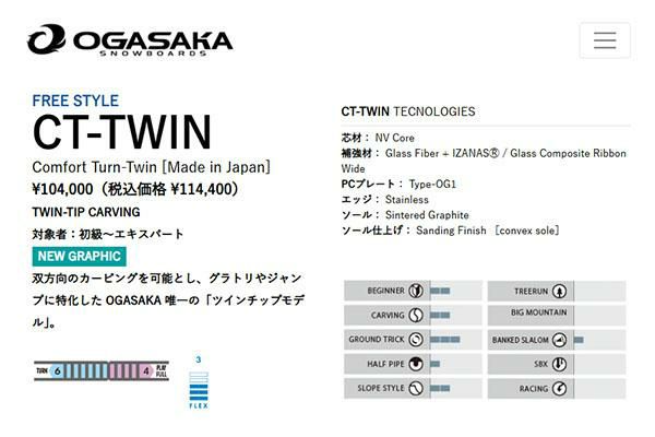 「CT-TWIN」は、OGASAKA SNOWBOARDSの中で唯一の「ツインチップモデル」であり、グラトリやジャンプに特化したモデルです。