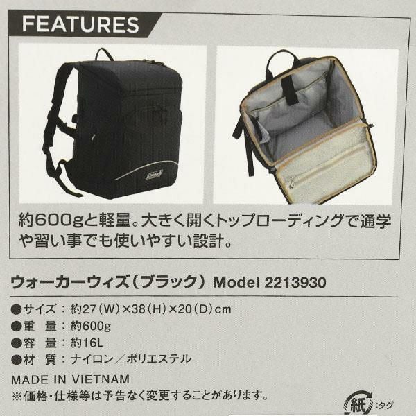送料無料 コールマン 子供 リュックサック Coleman 16L キッズ ウォーカーウィズ スクールバック レインカバー付き ブラック 黒 学校 通学 通園 2213930