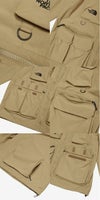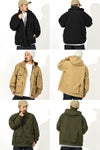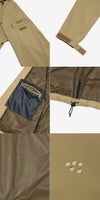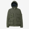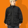 表地はコットンライクな表情のタスランナイロンを使用。はっ水加工を施しており、多少の雨や汚れに対応します。裏地は肌離れのよいポリエステルメッシュ。大容量のマチ付きポケットは、中身が落ちにくいように面ファスナー式のフラップ付き。右胸のハーフドーム型ファスナーポケットは、貴重品の収納に便利です。背面にも大容量のマチ付きポケットを配置。襟にフードを収納できるビルトインフード仕様です。