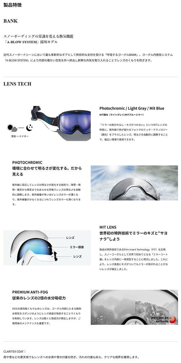 送料無料 スノーゴーグル DICE ダイス BANK バンク BK55194 調光 フォトクロミック MITミラー ユニセックス スノボ スノー ゴーグル 球面レンズ 2025-2026冬新作 25-26 25/26 10%off