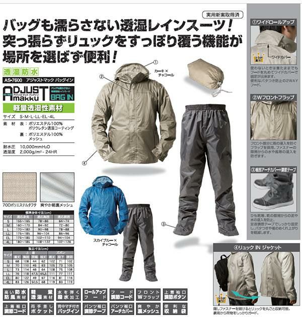 送料無料 かばんも背負って着れる レインスーツ リュック対応 上下 通勤 通学 自転車 バイク メンズ レディース 耐水圧10000mm MAKKU マック ADJUST MAKKU BAG IN アジャストマックライトバッグイン レインウェア 合羽 カッパ キャンプ アウトドア AS-7600